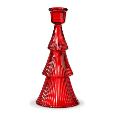 Add a festive touch to your holiday decor with this Red Glass Ribbed Tree Taper Holder. Made from soda lime glass, this holder is shaped like a Christmas tree and is perfect for holding a 10-inch taper candle.