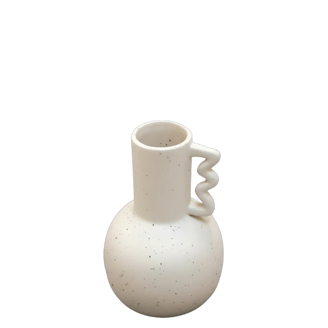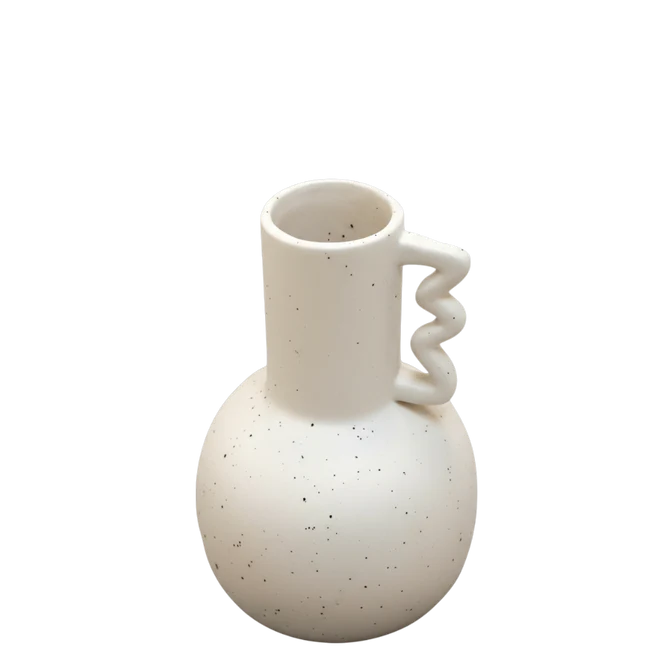 This white vase features a modern, artistic design highlighted by its subtle black speckled finish and distinctive zigzag handle. The smooth ceramic body provides a clean, minimalist backdrop, while the fine black specks add texture and visual depth. The bold zigzag handle serves as both a functional and decorative element, introducing a playful yet sculptural touch that makes the vase stand out. Perfect for displaying fresh or dried florals, or as a standalone accent piece, this vase blends contemporary style with handcrafted charm—an ideal addition to modern, eclectic, or minimalist interiors.